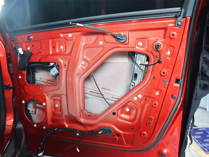 四门拆卸门板后一定要清理杂物灰尘(注意不能盲目拆卸,否则门板变形无法修复。建议选择专业改装店)