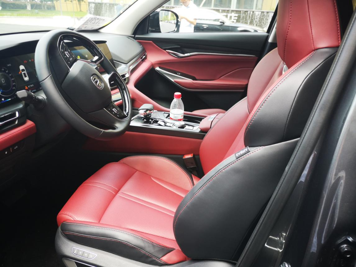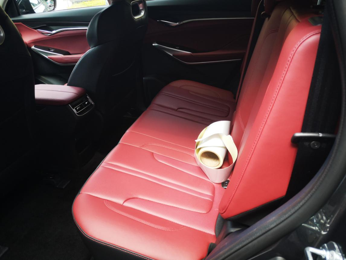 红色皮质座椅让整车豪华感特别强,前后排空间都非常充足。反正我坐里面腿部空间大概好几拳头的距离,头部也至少2拳呢。