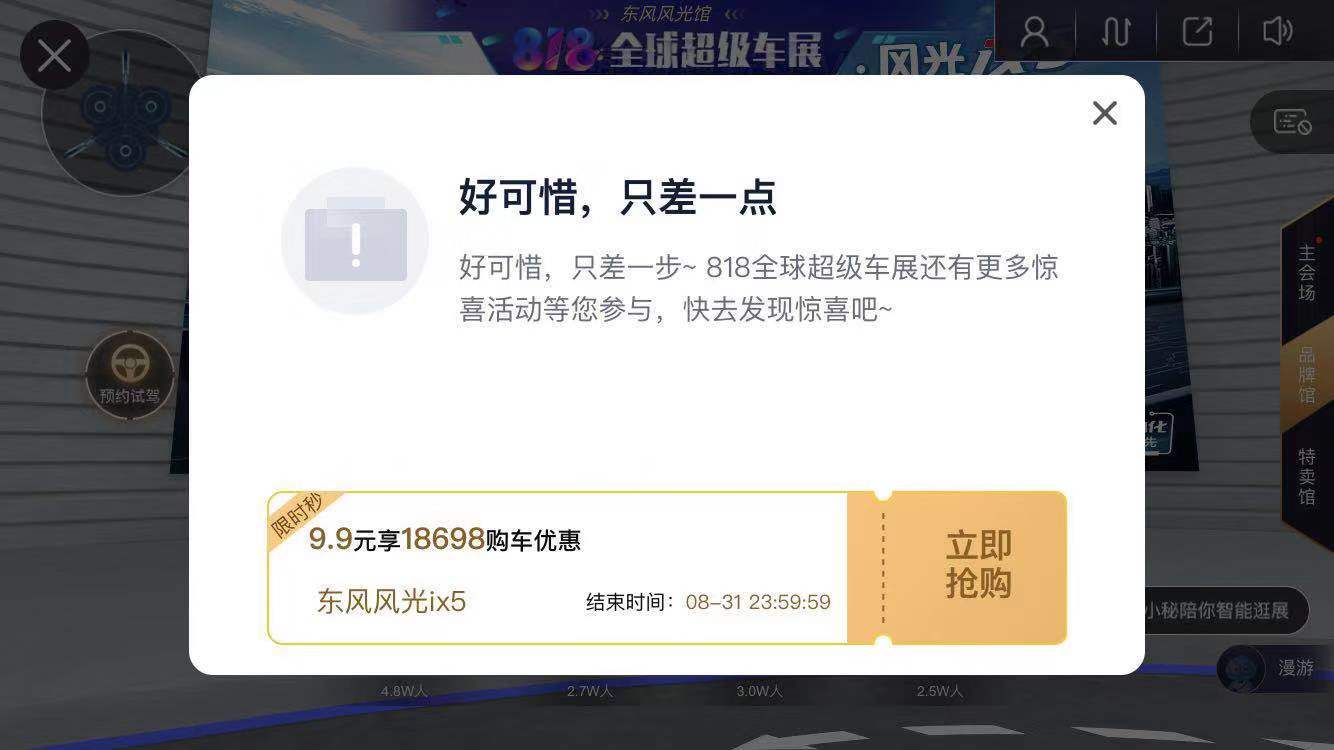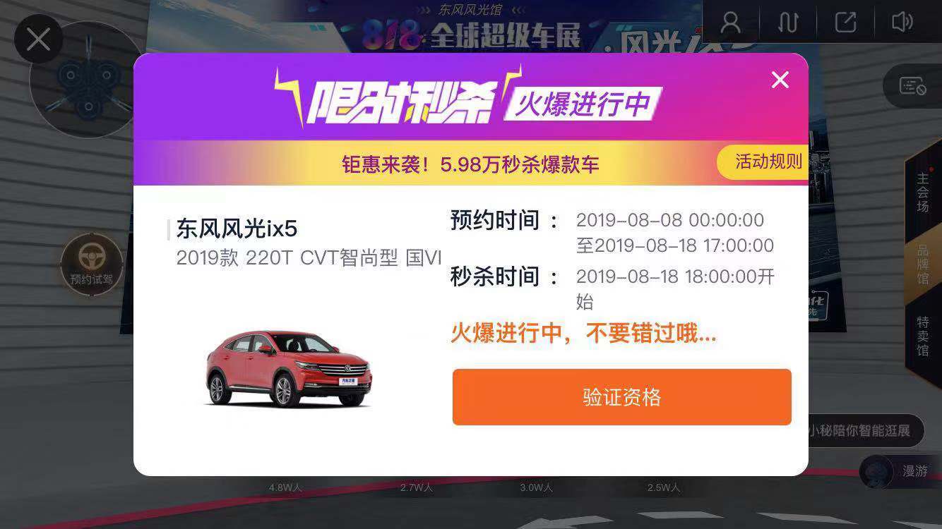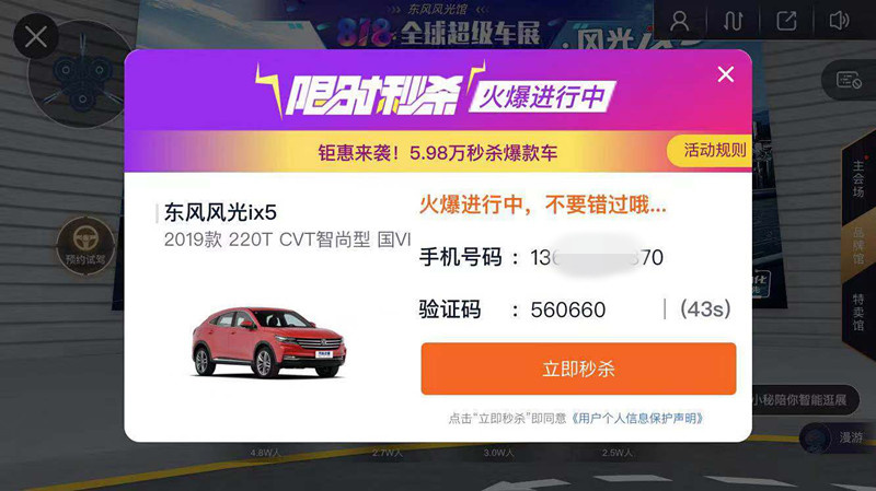 再向前走动,可以看到“钜惠来袭!5.98万秒杀爆款车”字样。这样的福利,当然不能错过。直接点进去参与秒杀。