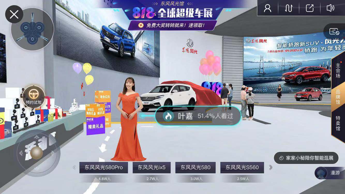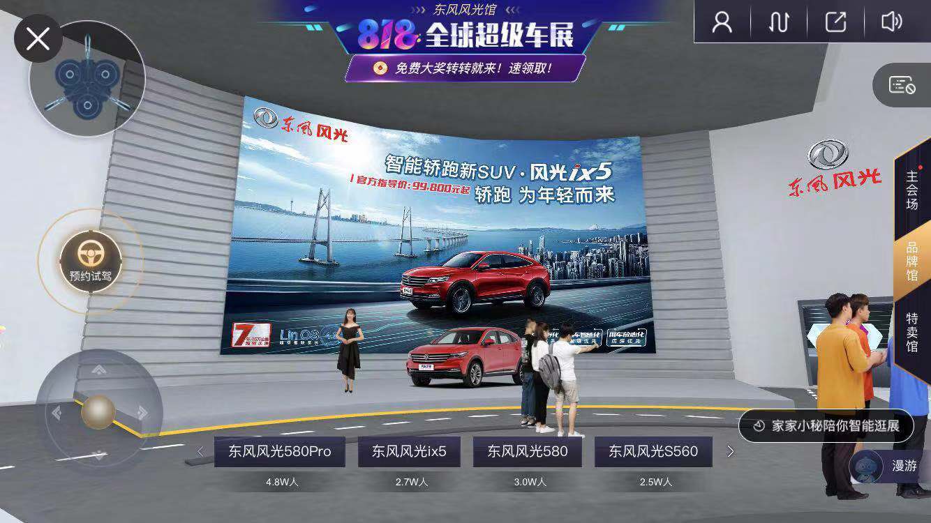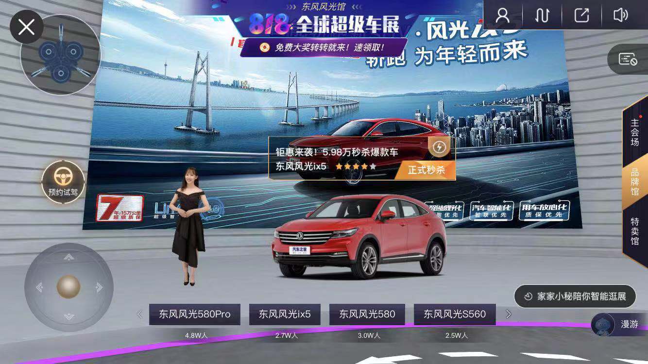 进入东风风光馆后,界面很吸引人,有木有。感觉就是在车展现场,身临其境。原谅我一开始不会操作,后来,才发现左下角有方向盘。哈哈。慢慢向右按,就可以看到秒杀车型风光ix5了。兴奋ing。