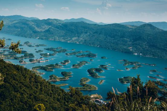 站在山头俯瞰仙岛湖,碧波中小岛竞秀,如同仙境一般。