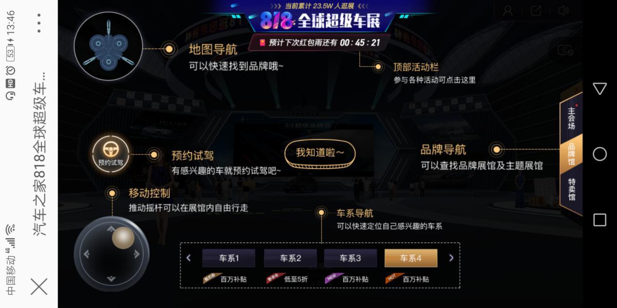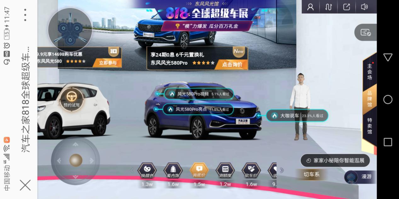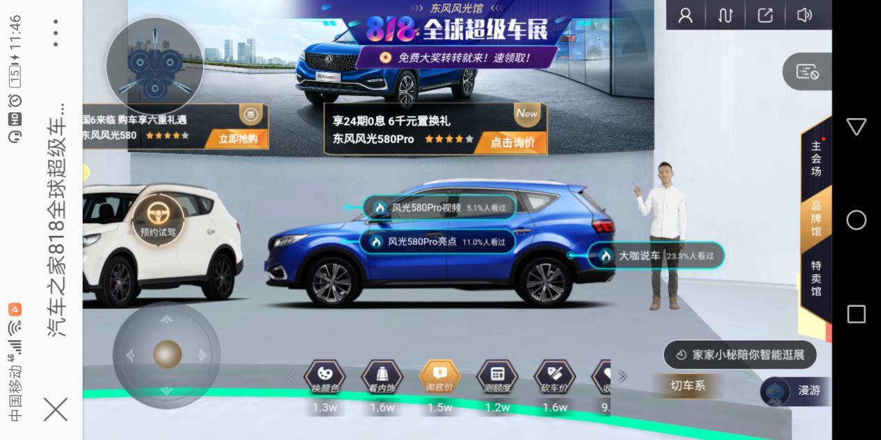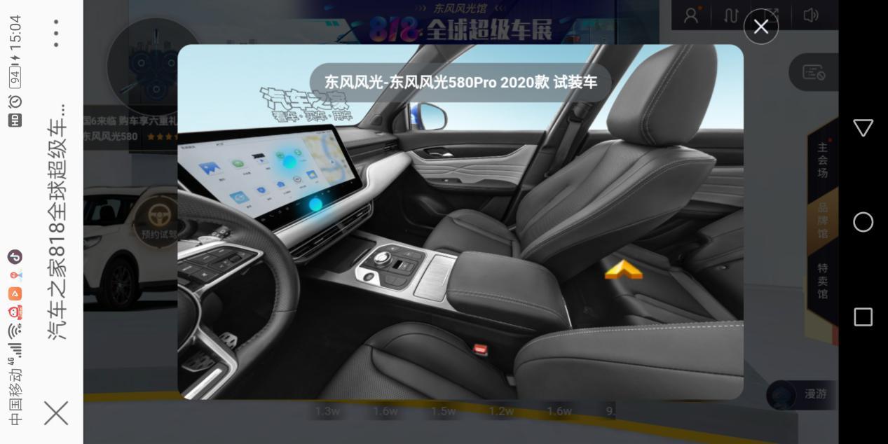 躺床上刷V博的时候突然刷到818全球车展,可以手机上面看车展,说什么“沉浸式”体验,有点惊喜,而且东风风光也在里面,最近准备下叉风光580Pro,之前的几次车展都没去成,毕竟每次产生去车展的冲动,都被人多路远,又热又累打回原形,怂了怂了。所以看到这个,为了风光580Pro兴趣一下就来了,刚准备看,手机显示电量过低,那有啥,马上找了个“续命线”给手机充电,继续看车展↓