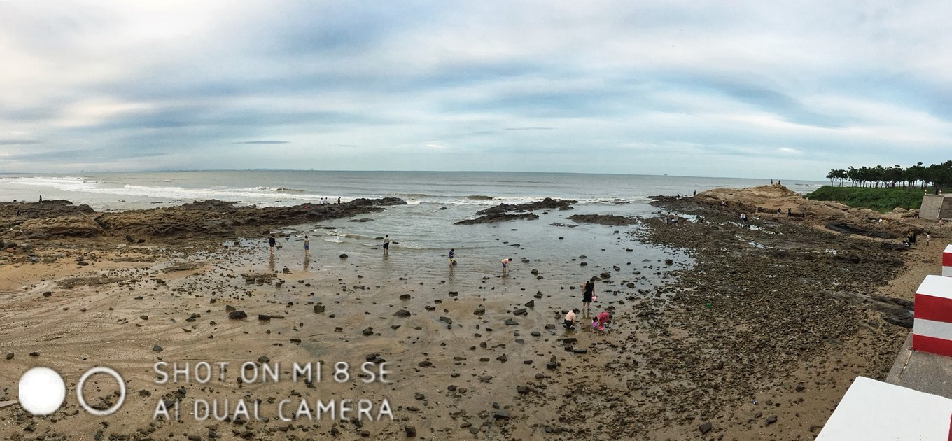 到四点多,大人实在太无聊,我们一起转移到附近不远的礁石区赶海!由于落潮时间是四点左右,我们等到六点才等到以下状态!玩了一会我们就准备去吃饭了,并计划第二天早点起来,赶早上的海,赶海需要在落潮后两小时去比较好,太早,水还没落下去哦