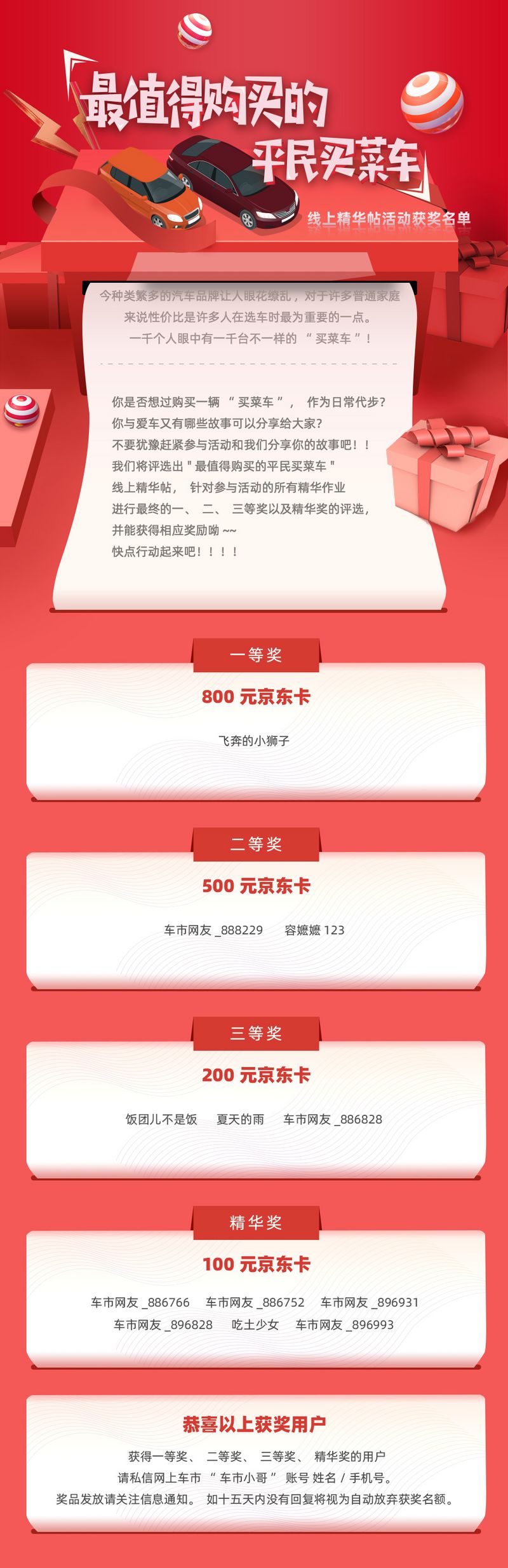 "最值得购买的平民买菜车"线上精华帖活动获奖名单