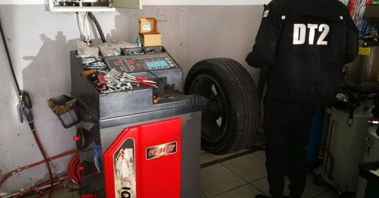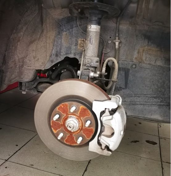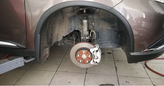 为方便卸胎作业,用举升机将车辆升起一些,轮胎离地,这样施工更为轻松。