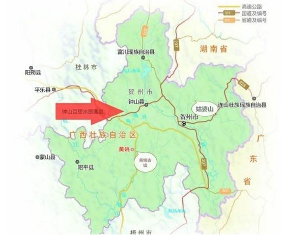 中山百里水墨画廊位于广西贺州市中山县,是广东、湖南、广西交界处的“中国长寿之乡”,坐落在323国道,距中山县县城18公里。百里水墨画廊自然条件优越,喀斯特峰林地貌,荷塘田园风光怡人迷人,桂东地方文化特色鲜明,公婆山奇石、伟人蜂、观音山等国内罕见,具有浓郁的爱青文化内涵,集牟丹田、水乡、田园、奇石怪村,具有“美、奇、险、神”的景观特色,稻田风光展现出浓有郁的桂东乡土风情。