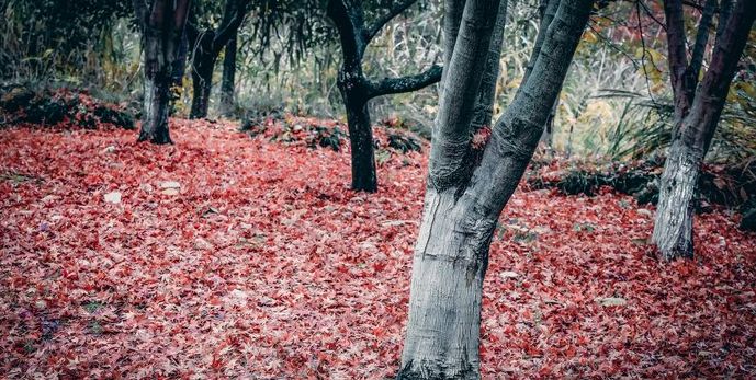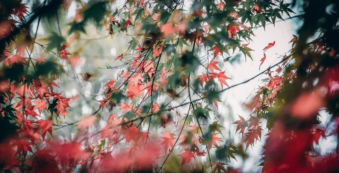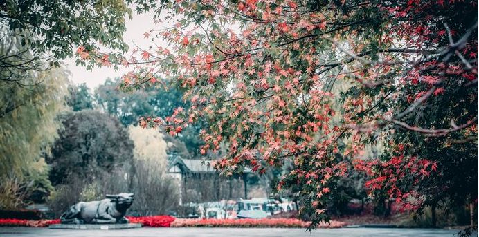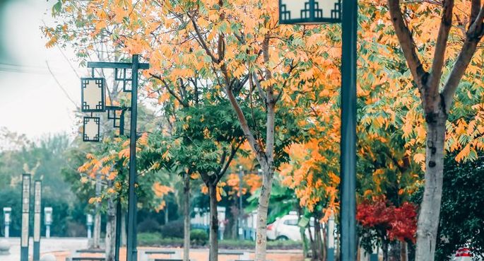 树叶正在换叶时期,地上落叶很多。我怎么感觉这个颜色的树叶要比全绿色的好看呢。