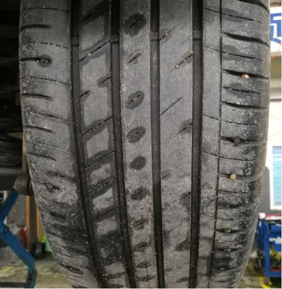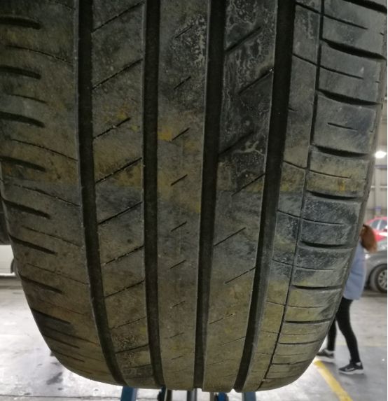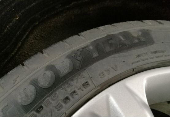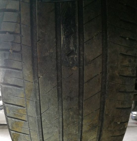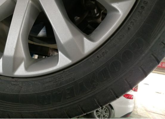 再来看看轮胎,这四个轮胎是于2017年5月换上的,是固特异御乘二代轮胎,目前跑了3.2万公里,大家帮忙看看磨损情况是否正常,有没有出现偏磨现象,这应该是右后轮