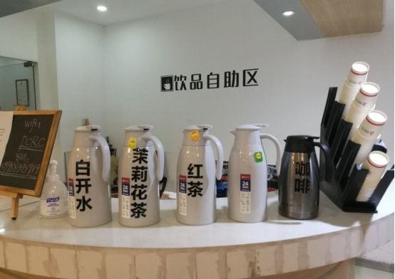 饮品自助区,有白开水、茉莉花茶、红茶、咖啡等
