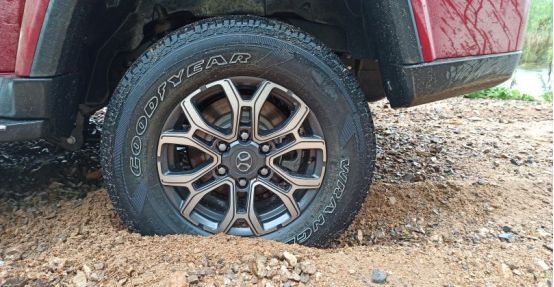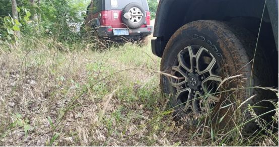 看我前面的40老大哥,四只轮子已经全是泥巴。