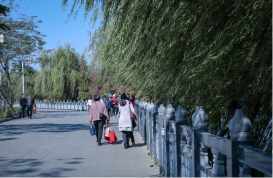 沿湖而建的景观大道边,栽满了垂柳,微风吹过,柳叶飘飘。