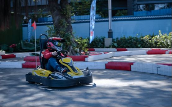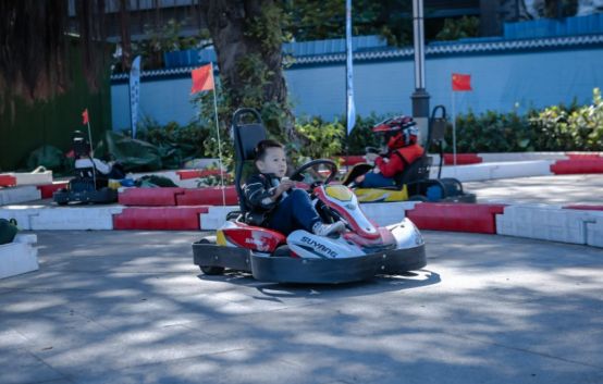 广场里卡丁车场里,帅小伙正在驾驶着卡打车,很专注,看起来很专业哦。