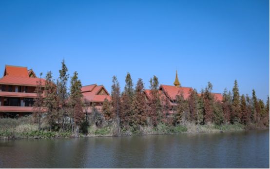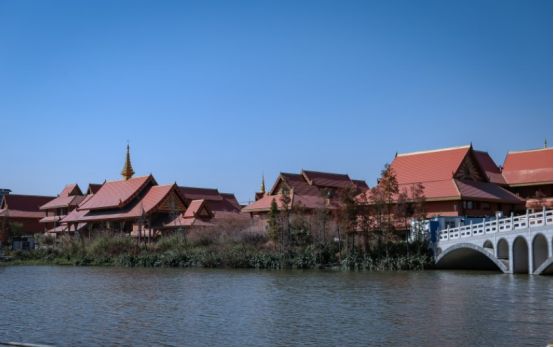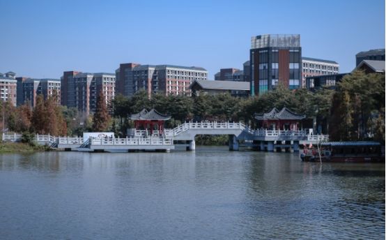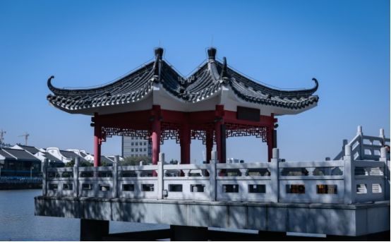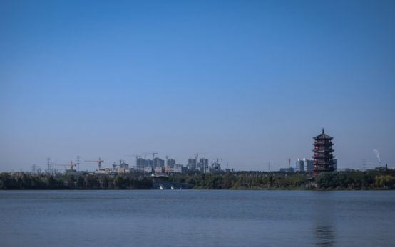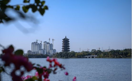 远处便是进来的大门,安静的湖面、华阳塔、兴华桥,还有远处在建的楼盘,一幅独特的画面。