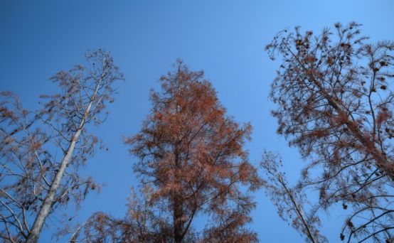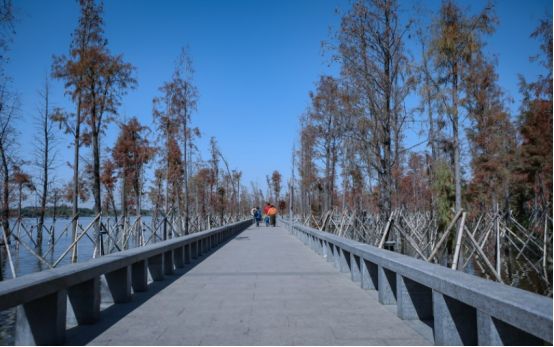 原来是一处修建在水面上的步道,两侧种满了水杉树,这个季节,水杉树叶已枯黄,在蓝天的映衬下,很有身处北方的气息。