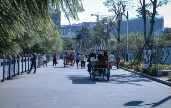 景观大道上,结伴而行的游客,还有骑着游览车的流客们,一副和谐的画面。