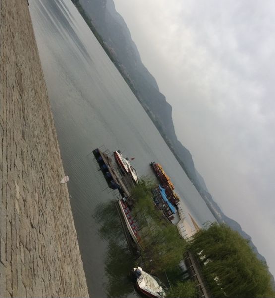 这个湖还是很大的,四周围绕着山,天来玩很凉快
