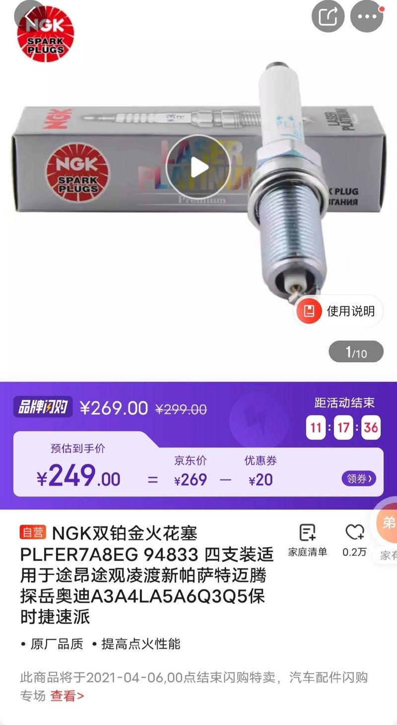 上次换的BOSCH,这次换换NGK试试,加入京东购物车很久了,前几天看到在做活动,就赶紧下单买了。