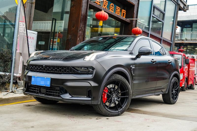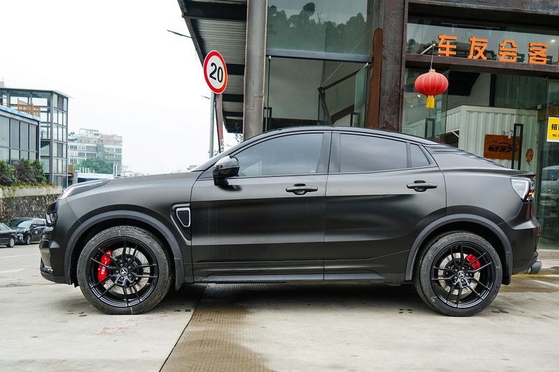 20寸轮毂的领克05,车主选择升级改装TEI Racing P60S六活塞刹车套件和后加大碟。前轮搭配378打孔划线纹分体盘,和后轮搭配355打孔划线纹分体盘。