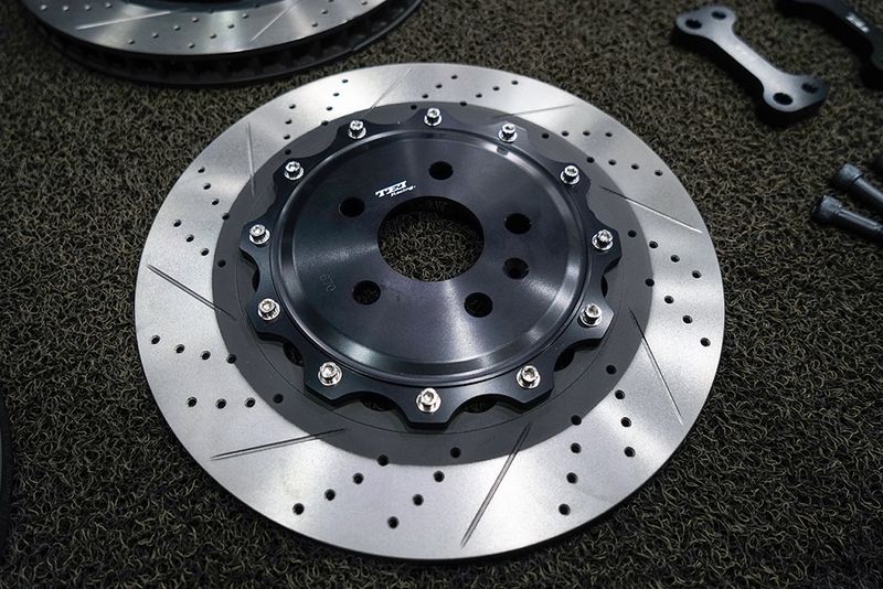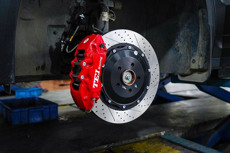 前轮:改装P60S红色大六活塞卡钳,搭配378x32mm打孔划线纹分体盘;