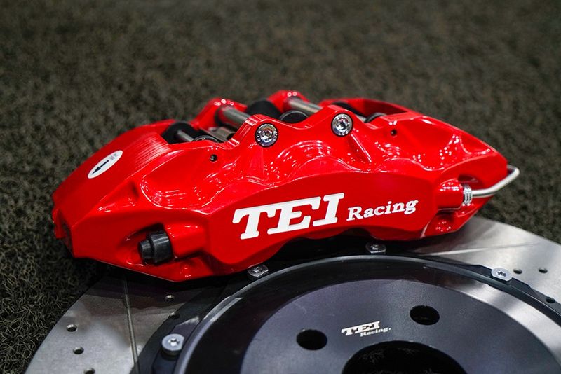 后轮对比差距也是一样很大的。原厂卡钳碟与TEI卡钳碟,原厂碟尺寸小,摩擦面积小,盘面没有花纹增加摩擦系数,最重要的是,原厂碟是实体碟,没有通风槽散热,耐高温性能差,高速刹车安全系数低。原厂刹车卡钳还是单式活塞卡钳。