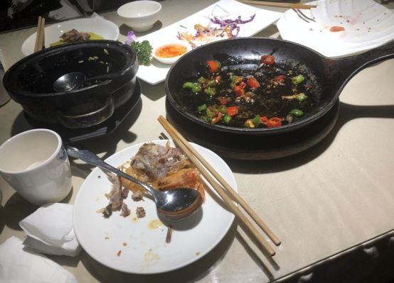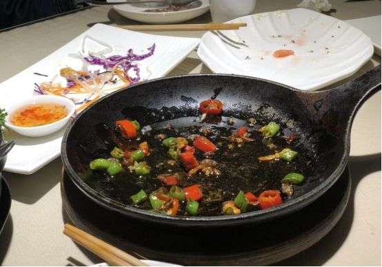 朋友不肯露脸,于是我转而拍了下旁边人家吃完的菜。