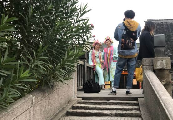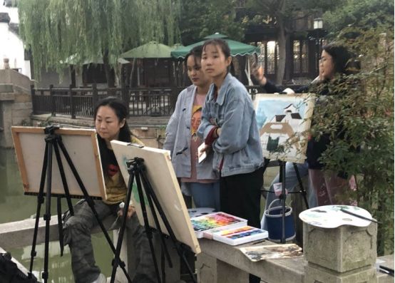 晚饭毕,雨也早已不下了。我们顺便到不远的古镇景区走了走,遇到一些来这里写生的大学生,孩子你得多穿点了,看把你冷的。