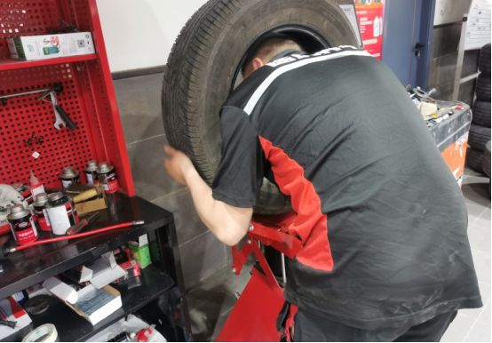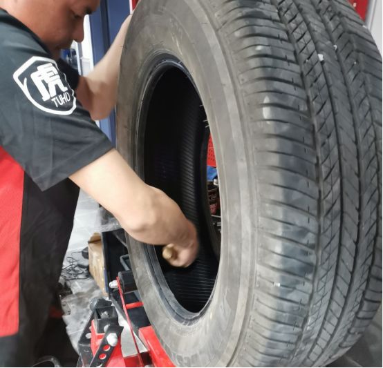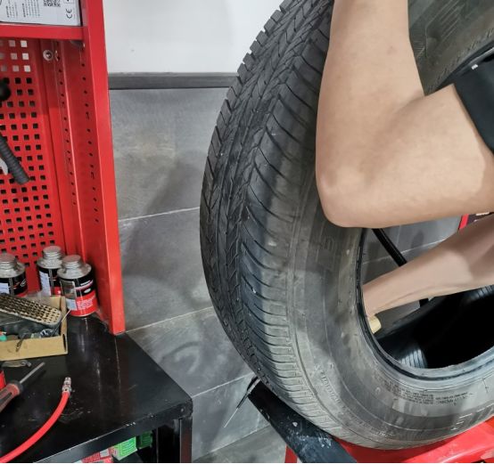 另外一个机器上,小哥正在忙活,正在进行另外一辆车的补胎作业。