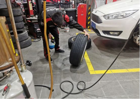装上轮胎之后需要检查轮胎边缘有无漏气的情况,正在使用喷壶进行喷水检查。
