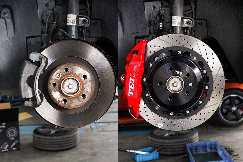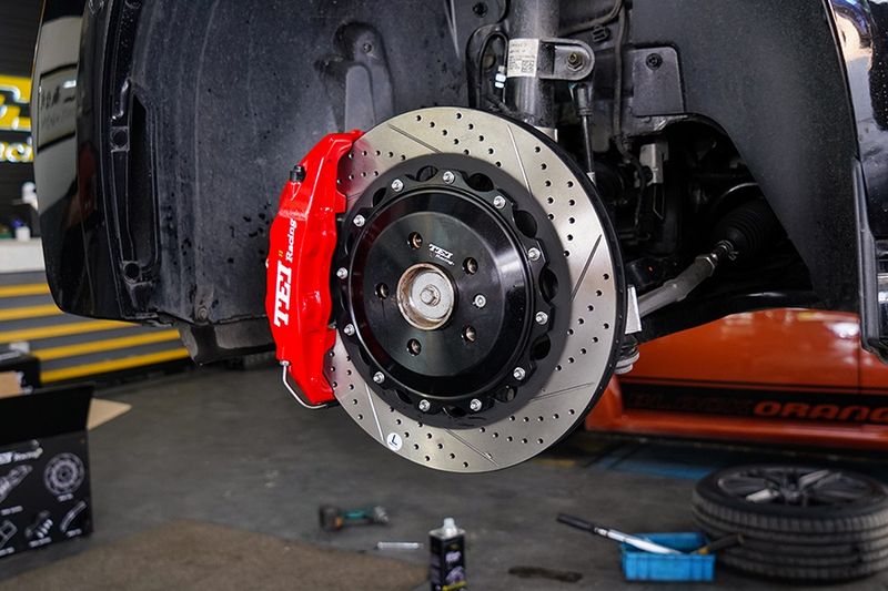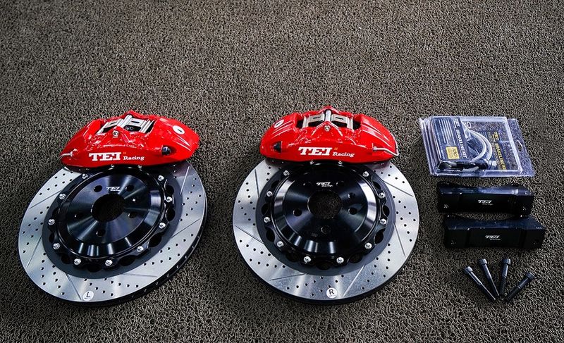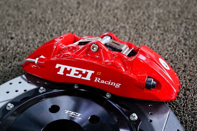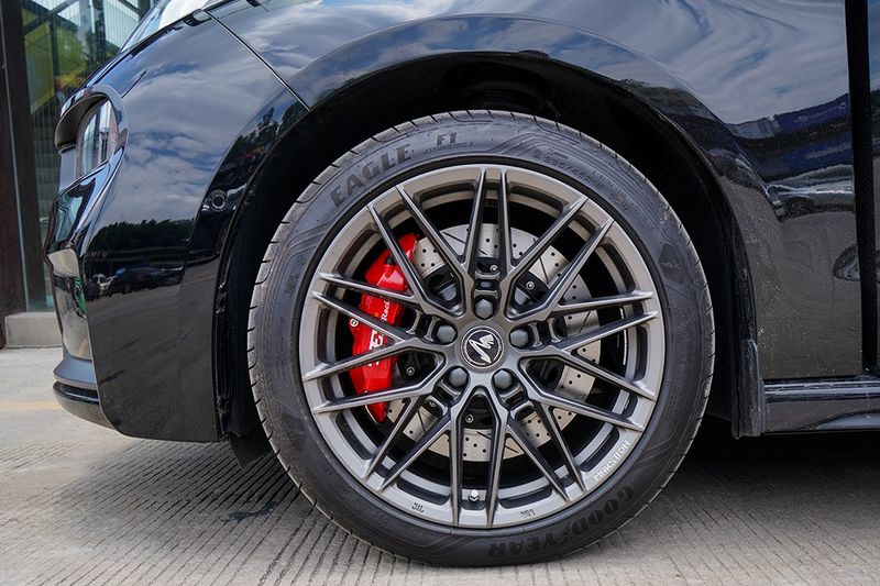 前轮:改装P40NS红色大四活塞卡钳,搭配355x28mm打孔划线纹分体盘;