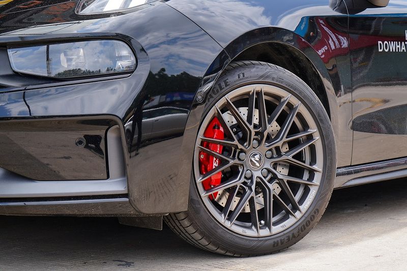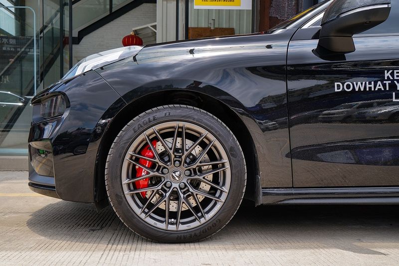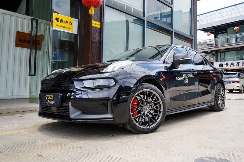 原车18寸的轮毂,领克03前轮刹车改装P40NS红色大四活塞卡钳,搭配355x28mm打孔划线纹分体盘。