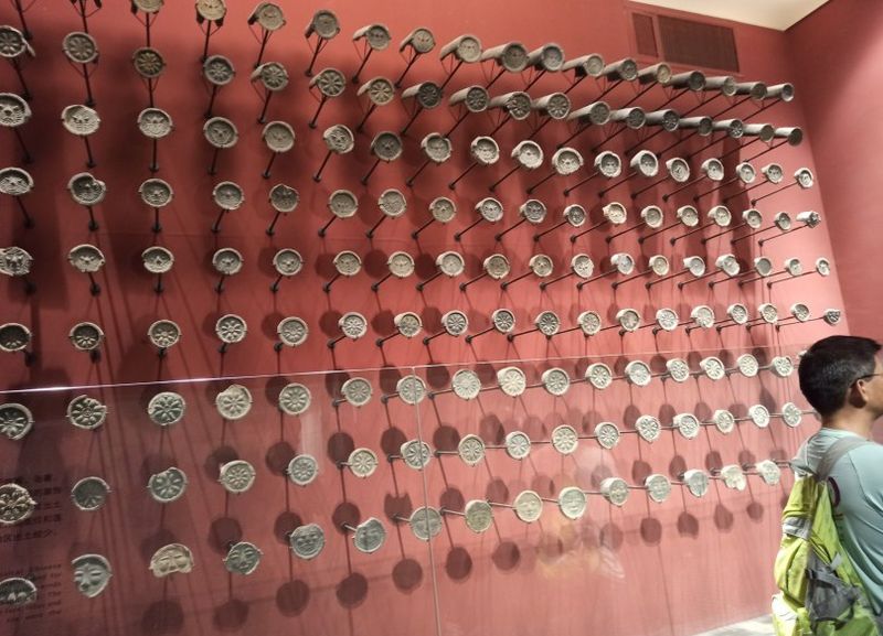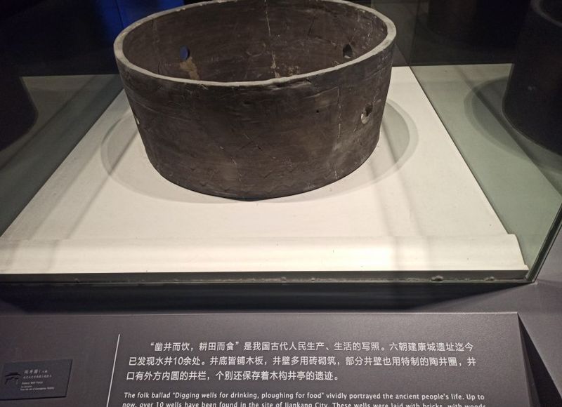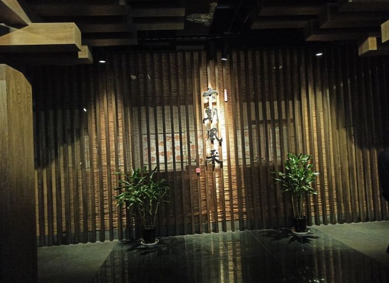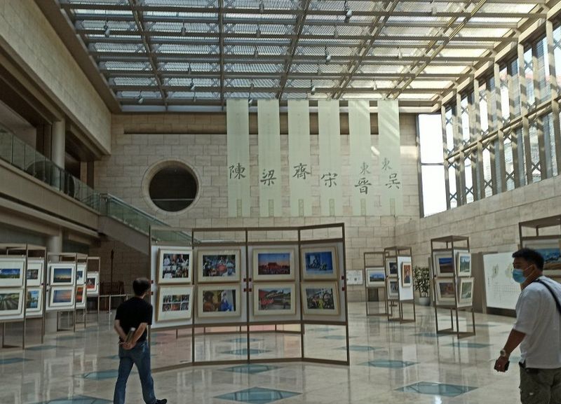检票走进大厅,发现整个大厅高大明亮,不同于别的博物馆,大厅里正在进行庆祝建党百年的百人百图庆百年摄影展,游客们都在安静的仔细欣赏摄影作品。整个六朝博物馆分成四层,我们决定按照从下向上的顺序参观,首先乘电梯到负一层,这里展示的是六朝遗迹。展厅里展示各种六朝的文物;有六朝历代的钱币,还有一处考古发掘出的排水设施遗迹,