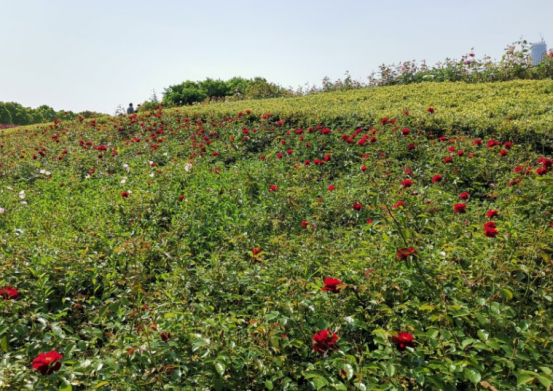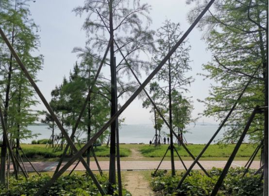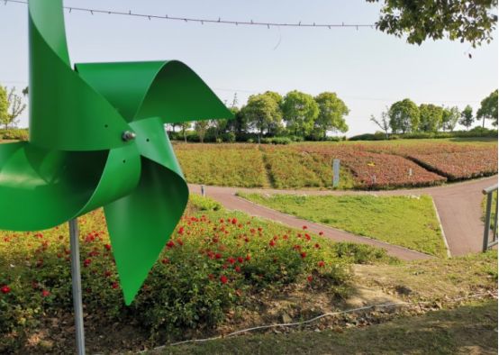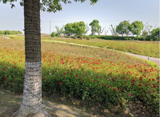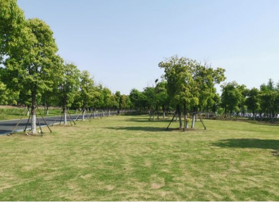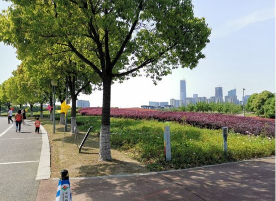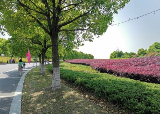 整个公园以绿色为基调,北侧林木区种植梅花、樱花、海棠等苗木近万株,绿树成荫,长达10公里的慢跑步道贯通整个公园,两侧布满百日草、三色革、松果菊、黑金菊等花种,门口有租借的自行车,可以沿着十公里的跑道骑行游玩,欣赏路边的美景。