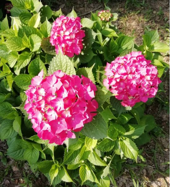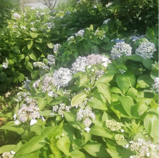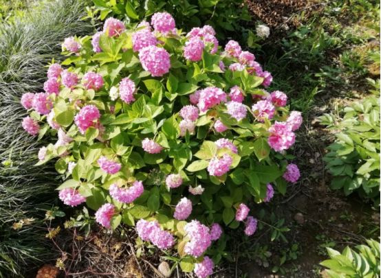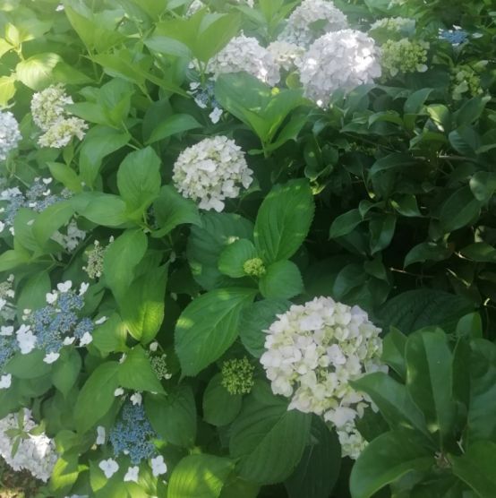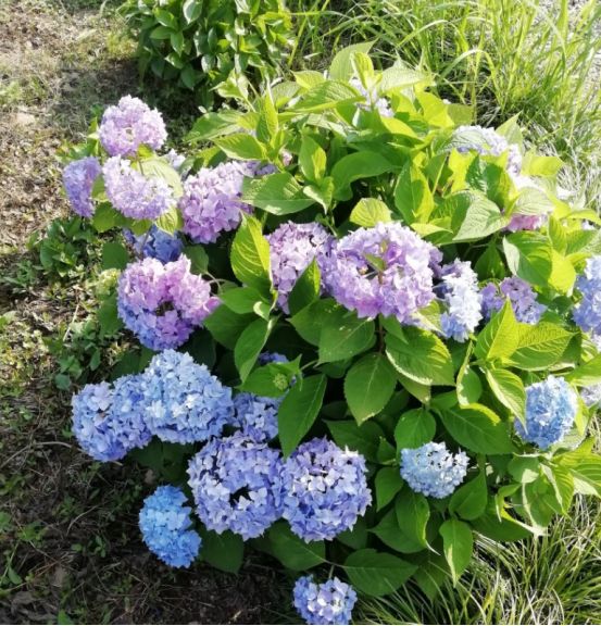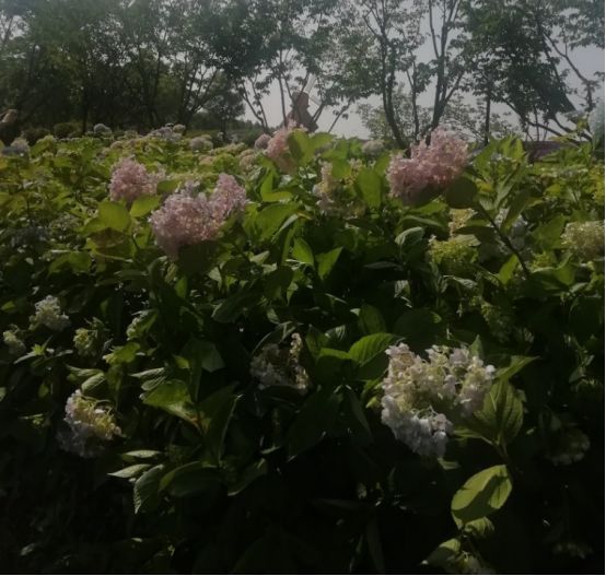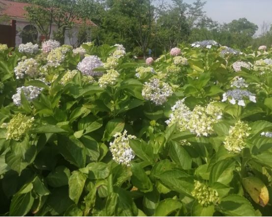 目前的花季是绣球花,你看那白的红的蓝的各种各样的颜色都有。