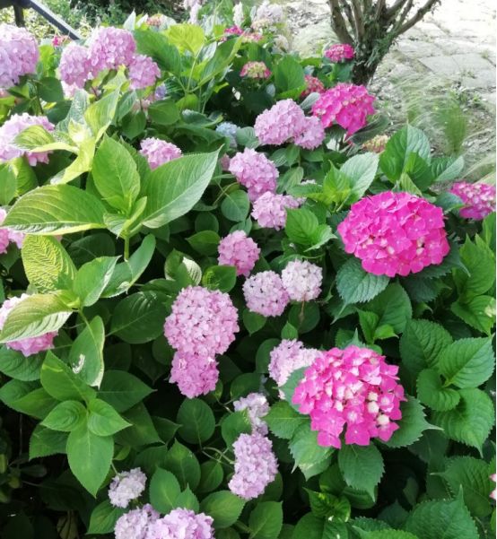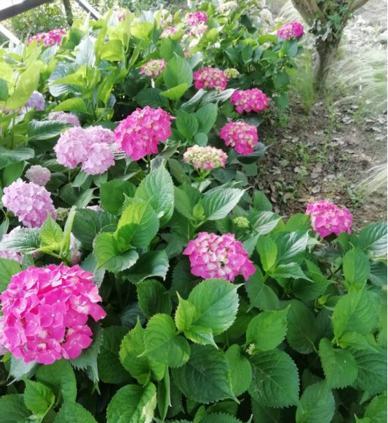 —眼玩过去绿色的叶子衬托着五颜六色的绣球花美不胜收。