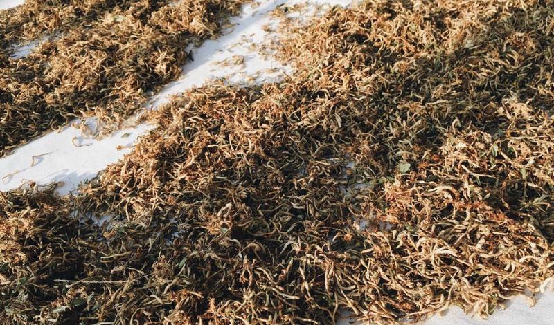 在农户家里看到晒干的金银花,听说满满两大筐晒成干也就这么些,所以这东西卖的贵是有原因的。