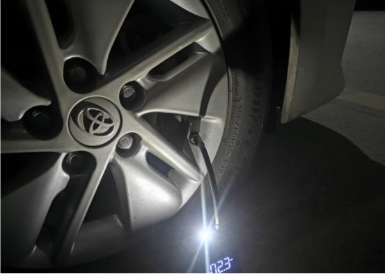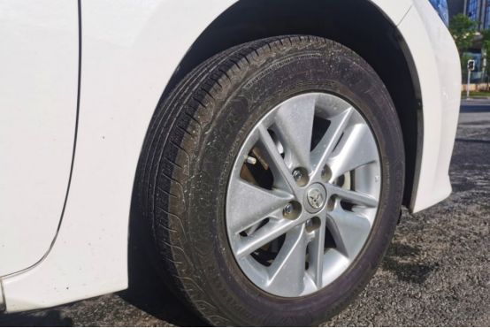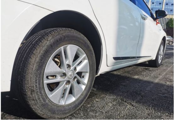 从轮胎表面附着的泥沙可以猜到, 这是经历了雨夜行驶的卡罗拉。