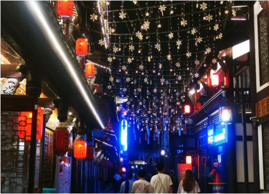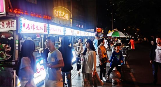 即使是在晚上九点,路边的小吃摊依然是通过通明,来来往往的人.