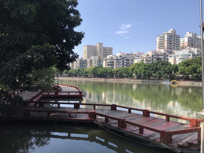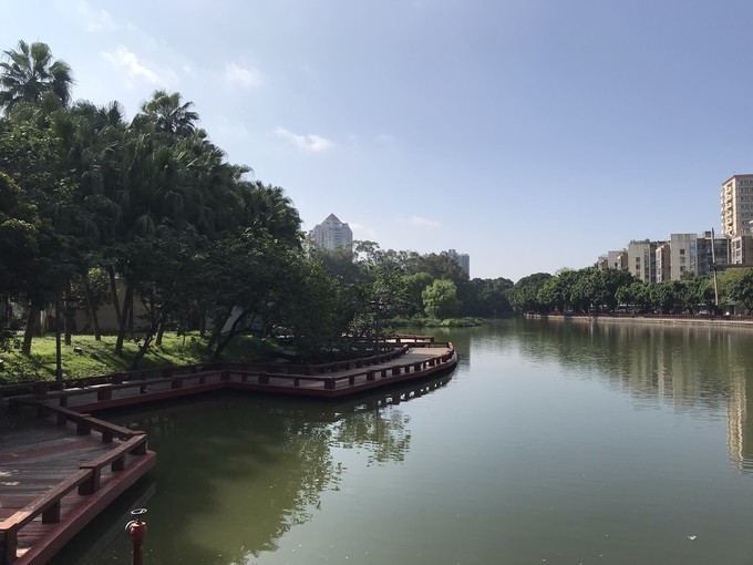 这里长堤卧波,垂柳夹道,漫步环湖步行道,观岸边高耸的棕榈树、楼阁台亭、回廊水樹相映生辉,成为沿路美丽的风景线。