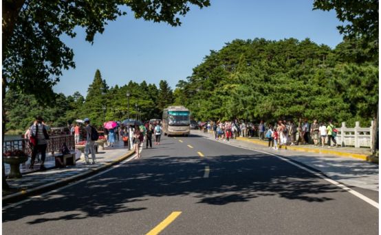 在路上我感到凉爽和清爽。走在用坚硬的石头铺成的极其平坦的道路上,游客们就像潮水-般,欢声笑语一片。