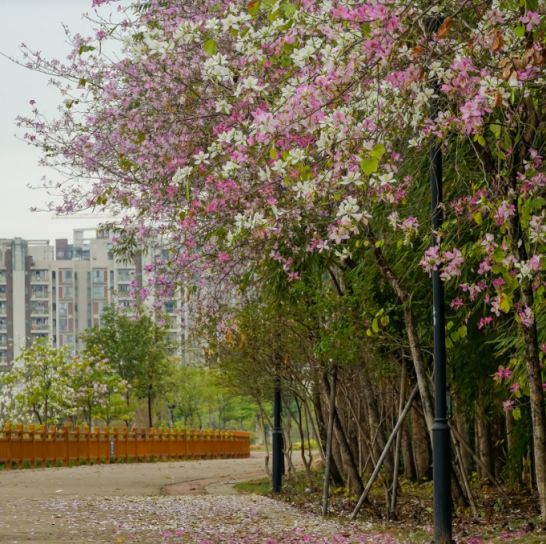 因紫荆花树常绿乔木的属性,再加上花期时间久,且带有怡人的芳香.故多用作公园、小区、道路两侧景观树.花开时.繁英满树,气味芳香.花瓣飘落,落英缤纷,非常好看。