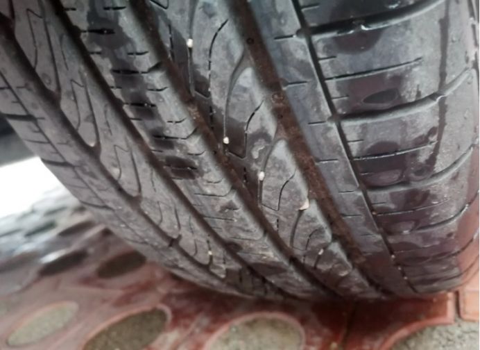 检查胎面缝隙里的小石子,因为郊区的路太差了,为了安全起见,找个一字螺丝刀扣一-下吧。
