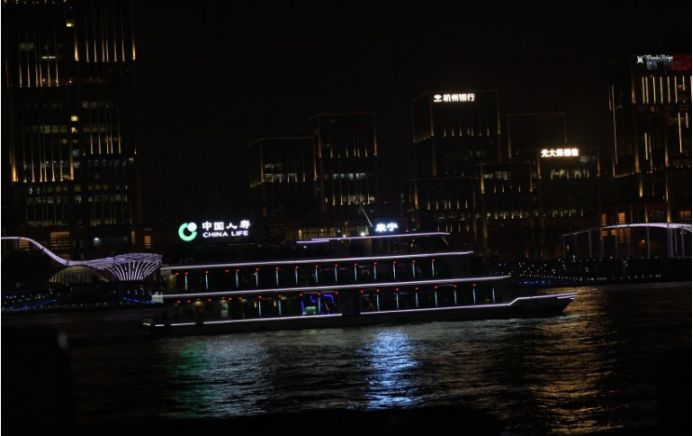 我是从浦东坐船,到浦西, 黄浦江的按轮很便直,坐船懂跨黄浦江,欣赏外滩夜具