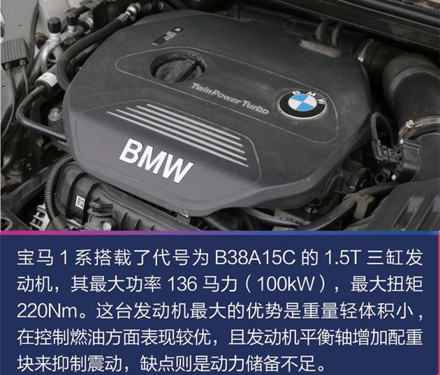 第三代宝马1系全系采用B系列发动机,这台19年出厂的118i搭载代号B38的1.5T三缸发动机,匹配的爱信6挡手自一体变速箱。最大功率136马力(100千瓦)以及峰值扭矩220牛·米的数据与竞争对手相比稍显孱弱,账面数据逊色于奔驰1.6T和奥迪A3的1.4T发动机。实际驾驶感受也感觉动力储备不足,前段还好,中后段加速力不从心。