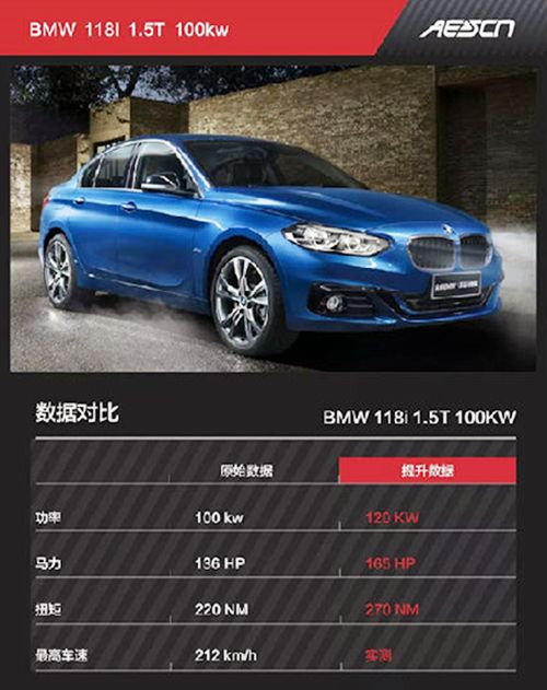 艾森发布宝马118i程序方案:一切以安全、稳定为前提,在不损伤发动机寿命前提下,将动力优化至最佳,同时符合车主的驾驶需求,性能参数如下: