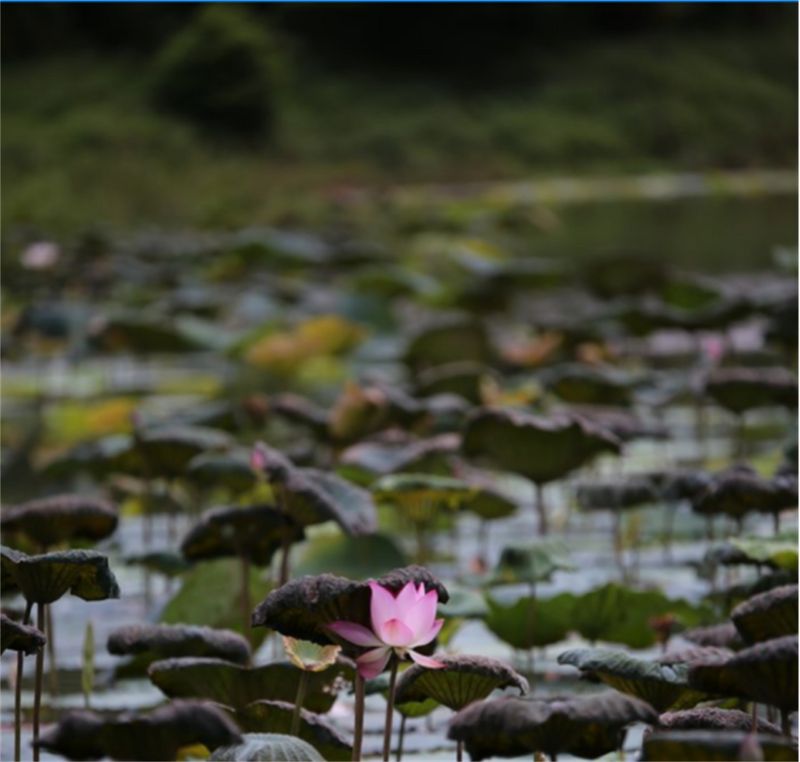平常喜欢拍一些花花草草,这次试镜,来到了附近的公园。荷花花期已过,只剩下残荷,那就拍拍残荷吧。渐渐枯萎的荷叶丛中一朵盛开的荷花。