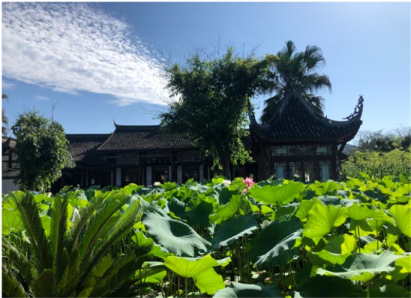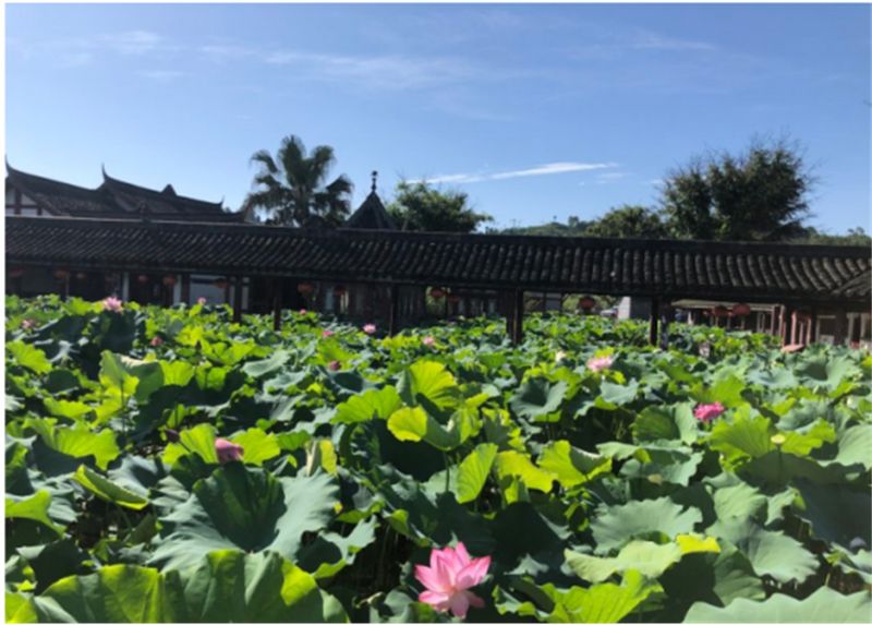 天地之间,只剩下荷花田田、古典建筑、蓝天白云~~~