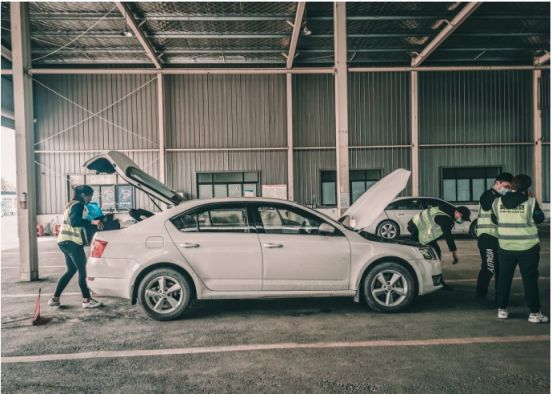 审车开始了,先是在大厅把相关资料提交给工作人员,然后自己把车开到检测点,把车钥匙交给工作人员,你就可以离开了。出于对审车的好奇,我帮忙把后备箱清空后.还是站在边上观看了一会。 工作人员上来就检查车子有没三脚架,当然有了,我的小明车里的三脚架还没有拆过呢。