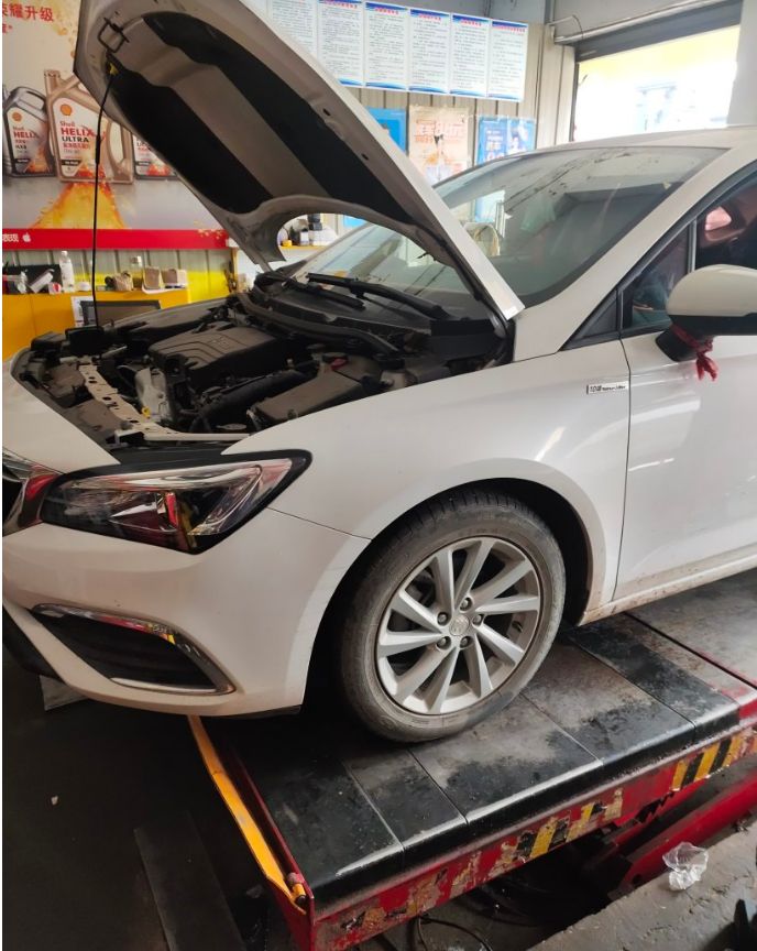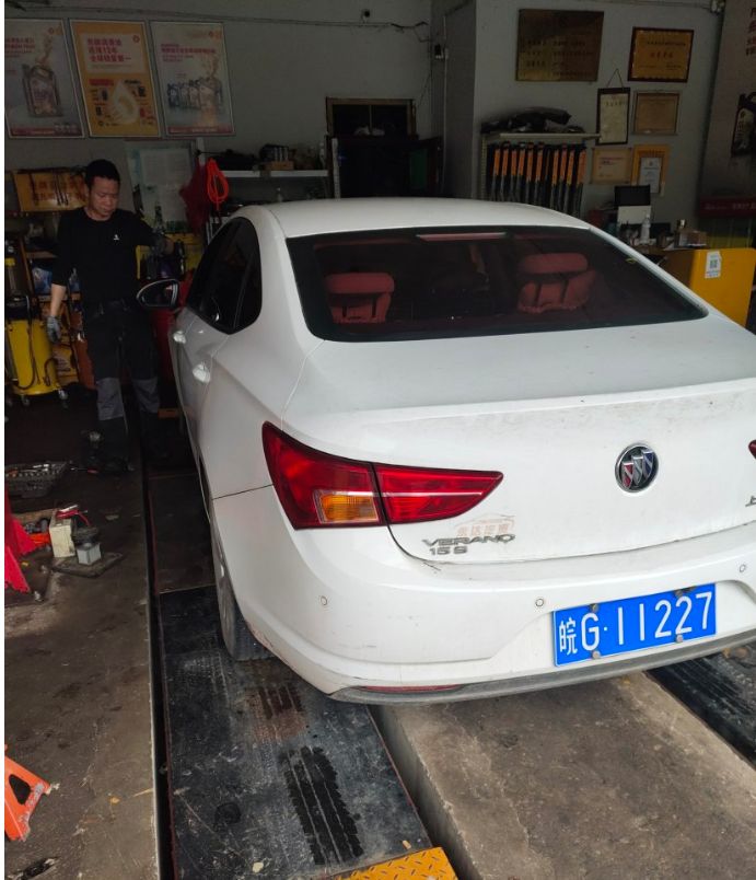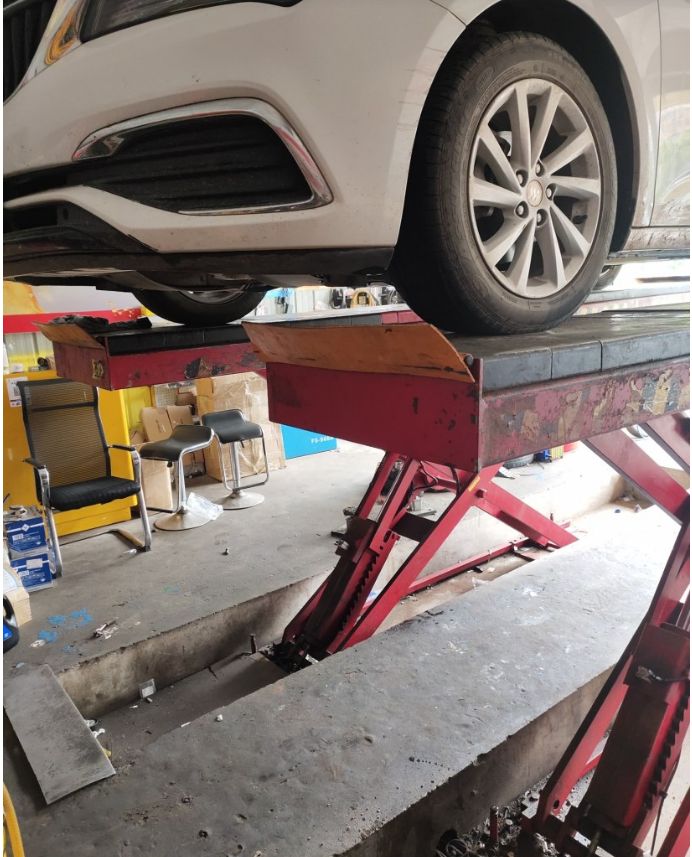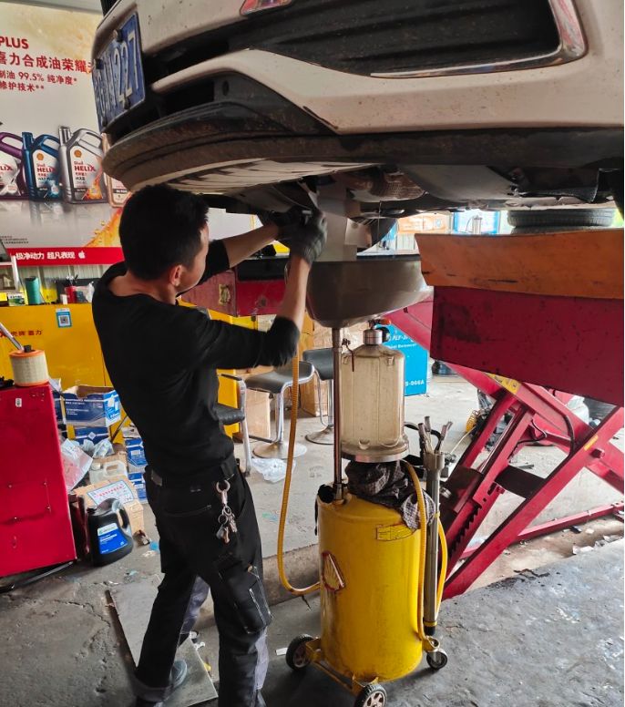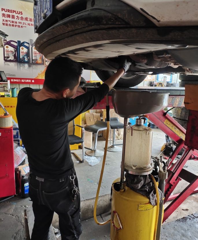 首先开车来到了这家汽车修理保养店,跟他们说好了自己带的机油!然后收取60元保养手工费!然后就把车子开到指定的保养升降机子上了啊!