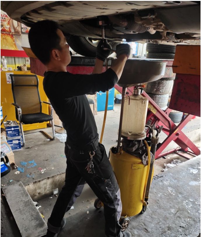 好了,轮胎和车身还有底盘都检查好了,师傅开始给爱车放机油了额!只见师傅拿了一个套筒把旁边螺丝给拧下来.把机由放差不多了,然后再把机油滤芯给拧下来了!