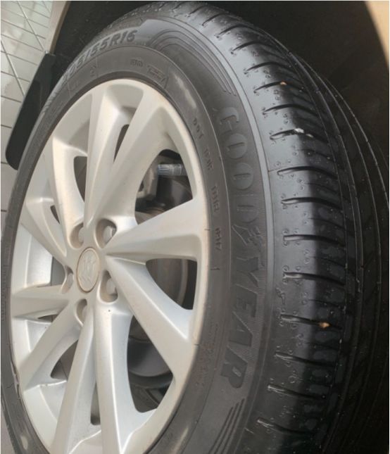 轮胎的侧面并没有很明显的老化裂纹,这也是轮胎更换的标准之一。
